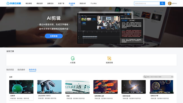 实现课堂实录的规模化管理和智能化应用,结合AI剪辑技术的精品课程在线创建,各类公共资源的统一接入管理,实现校本资源的共建共享。